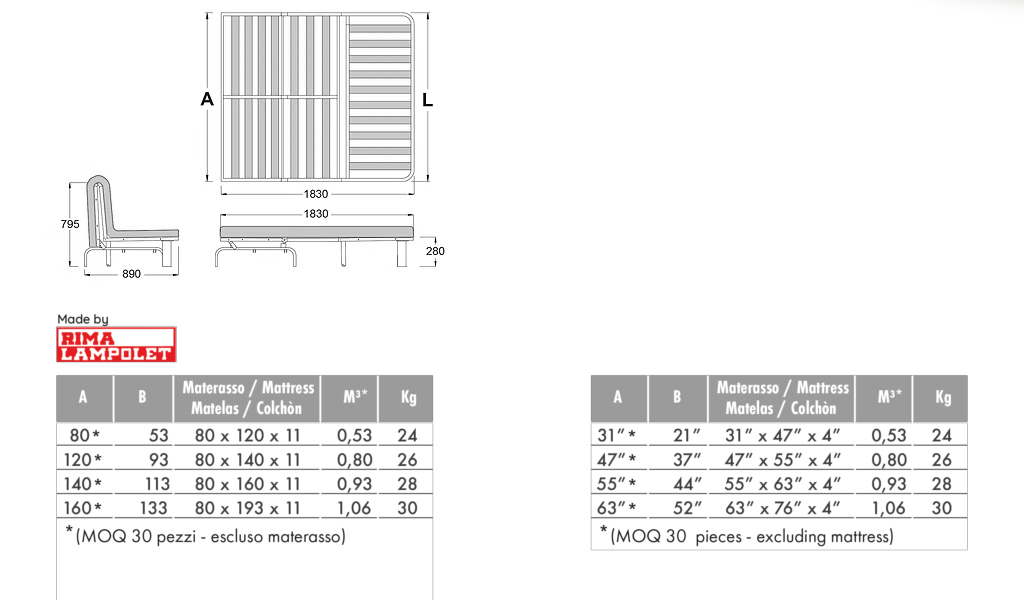 Può accogliere materassi da 10×190 cm. Disponibile solo per quantità.